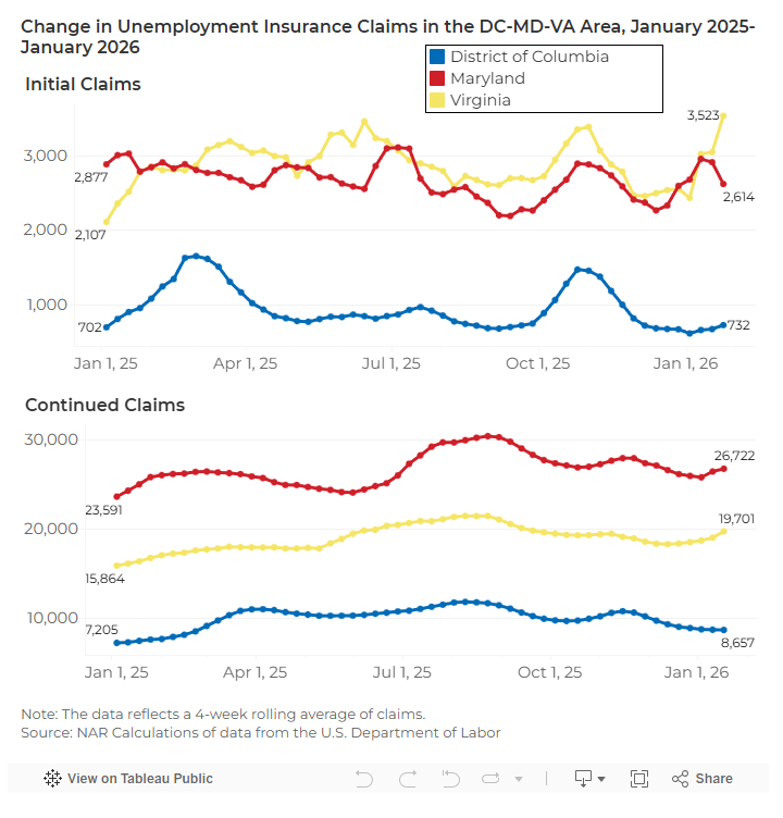 In the D.C.-Maryland-Virginia (DMV) region, initial claims rose in Virginia and the District but declined in Maryland. Continued claims decreased in Maryland and Virginia, while showing a modest decline in the District. These mixed dynamics reflect the impact of federal government layoffs in 2025 alongside a broader weakening of the labor market at the national level.